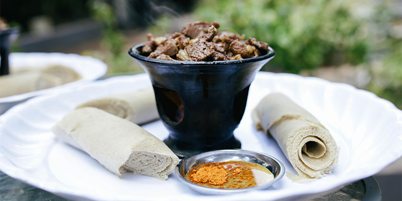 En Ethiopie, encore plus qu’ailleurs, le repas tient du moment de convivialité et de partage. Ici, manger ne se conçoit ni seul, ni sans Injera. Lors de votre séjour, il vous sera impossible de ne pas goûter, ne serait-ce qu’une fois à cette large crêpe légèrement fermentée et véritable plat national.